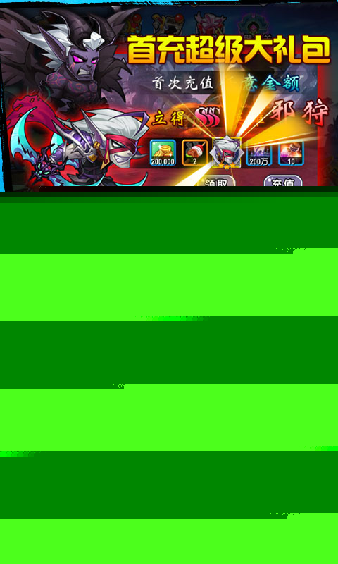 1、首充可以选择3倍或者2倍档位充值,礼包直接赠送SSS英雄邪狩(可以在战斗中,变身成为魔王形态,怎一个帅字了得!),还有大量金币、升级秘药,增加了可玩性!只要玩得舒服,首充就值得!