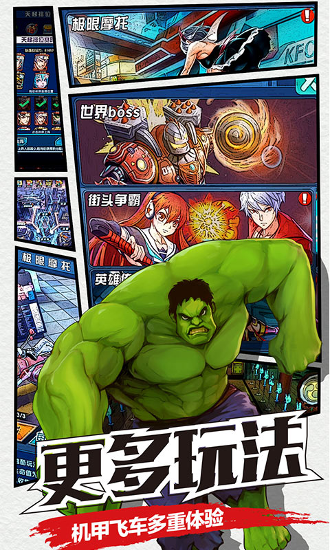 游戏制作精良,玩法丰富多样,游戏中超多热门英雄人物将一一登场:蜘蛛侠、拳皇、火影。