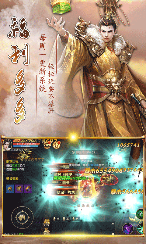 2、上线就送满V,绑元*68888,金币*200W,更有高达30倍的投资返还和月卡返还,各种福利礼包低至1元,返利比高达270倍;