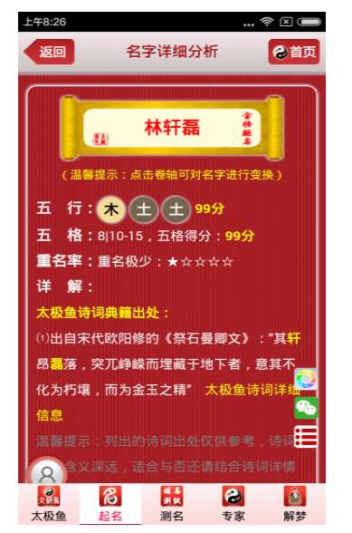 该应用是关于周公解梦的小工具,里面涵盖了情爱,鬼神,建筑,动植物,人物,生活,身体,物品,自然等几乎所有类型的梦境。类型下还有细分,可以说是太极鱼起名算命。 梦,准确的说,其实也是人的第六感的一种表现状态,因此才会有解梦这一说。众所周知,第六感又名“超感官知觉”,俗称“预感”。人类的潜在的第六感是在其它五个感官受到一定的刺激后,才会激发,因此产生出的。 因为人本身有第六感的预感能力,因此在梦中,第六感所产生的能力也是同样呈现的。睡梦中第六感所预见到的一些事情,未来的生活中会验证。因此,也就有了“解梦”一说。
