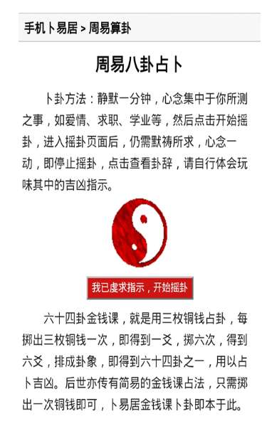 您是否对前路感觉迷茫困扰呢?是否常常通过抛硬币决定事情呢? 现在这些都不用啦,因为有了《周易算命生辰八字》,通过文王六十四卦占卜,为您测算运势、升学、事业、财运、交易、经商、出行、恋爱、健康、子女等等。只要手指轻轻一点或者摇动手机,便可卜卦天下事。人品爆发,遇到百年不遇的好卦时,还可以收藏在本地时时查阅,或者分享到微博,向朋友们show一show。