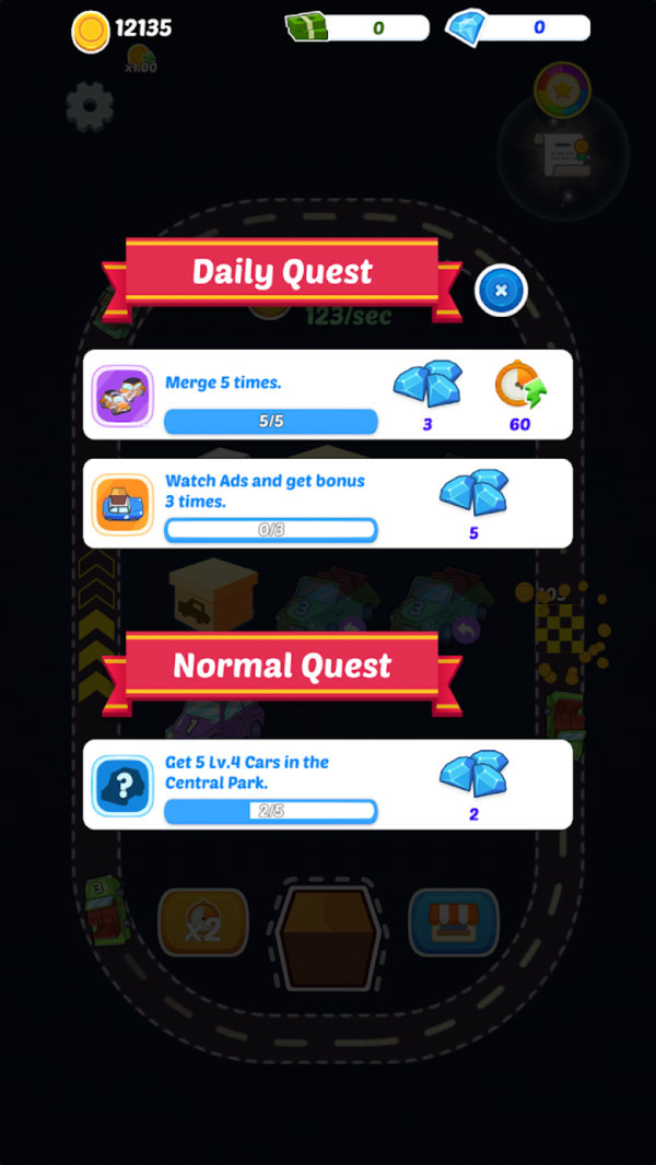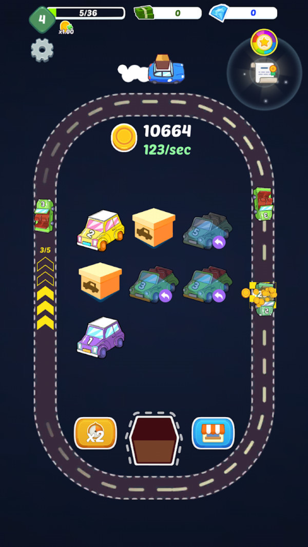2、合并车辆升级,赚取丰富的金币,将你的流程全部半自动化,赚钱更快。