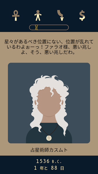 是一款文字类剧情手游,游戏中我们将化身为我们的法老王,并在游戏中做出我们的的选择,游戏中我们的国家将以4种形态进行产生,我们需要做的就是帮助我们国家得以在游戏中进行平衡,丰富的游戏剧情,将为玩家们带来超强的代入感,丰富的游戏道具,将可以帮助国家在危机中得以生存,丰富的游戏结局,等待着玩家们一一的进行我们的探索!