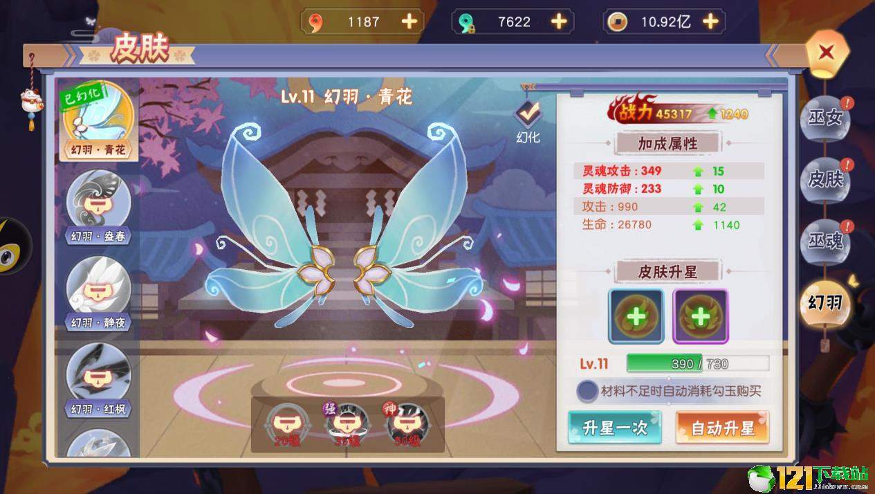 巫女的成长分为两部分,进阶获得新的外观和技能,属性增强拔高战斗力。随着等级的提升,还有皮肤、巫魂和幻羽等大量属性加成奖励模式等你来开启噢。