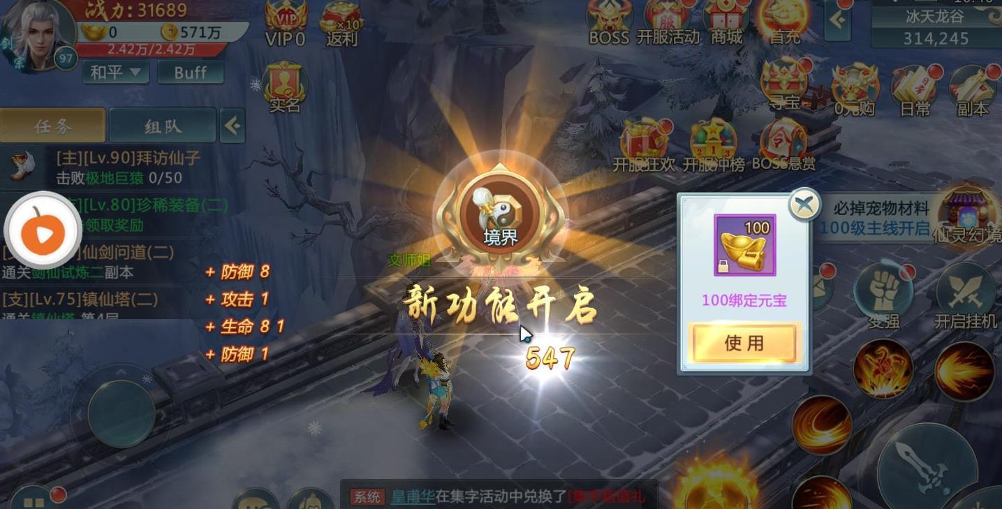 1、玩家在仙界会进行一些热血的战斗,在战斗中,玩家可以策略进行搭配自己的各种技能仙术使用,震撼击杀敌人。