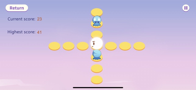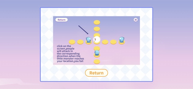 《冰冰功夫》中有一个由13个圆形平台组成的十字交叉的擂台,卡通小人位于正中央,从擂台正对的四个方向会不断出现小怪物并向交叉点移动,一回合移动一个平台的距离。你需要在小怪物到达中心点时将他们全部击落,按住卡通小人向对应方向滑动,它便会像该方向攻击。每击落一个怪物都会获得相应的得分。如果让小怪物穿过抵达了中心点,游戏结束,你将输掉比赛