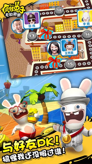 《疯狂兔子:无敌跑跑》是一款由Ubisoft开发的融合了《疯狂兔子》系列世界观的竞速跑酷游戏。玩家在游戏中需要操控疯兔在不同的环境之下四处奔跑,在游戏之中收集饮料罐和金币。玩家在游戏中要完成多个不同的任务,一次来增加自己获得的金币数料。玩家可以在游戏中解锁不同的疯兔造型,以此来打造自己的专属的疯兔,警察、忍者、棒球运动员、救火队员等一应俱全,甚至《刺客信条》系列都出现在了本作之中。游戏的目标与系列保持一致——回到月球。