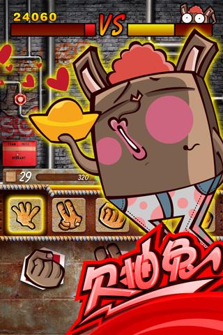 2、【操作:触控消除】游戏使用了消除游戏的模式,只要触控点击屏幕的石头、剪子、布即可操作。成功战胜对方就为消除成功,也同时会对兔子进行海扁!