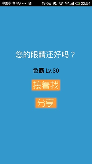 继《看你有多色》之后又一新做,这是一款完全免费的小游戏,小巧有趣,操作简单,容易上手,看似简单,其实不然。游戏画面十分简单,玩家在屏幕中色块区域选出不同的色块,越往后颜色越相近,越难选。看看您是色盲,色郎,色狼还是色魔还是色圣,还是色仙。