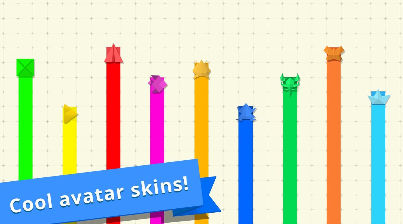 折纸大作战是一款很好玩的多人在线竞技游戏,每位玩家在游戏中使用一张折纸,可以折叠出各种各样有趣的道具,攻击敌人的尾部消灭它并将它的造型剪短,最长最大的玩家可以获得最后的胜利。游戏中玩家控制的是一条可以无限延伸的纸条,通过圈地来赢得胜利!玩家在折纸大作战中可以选择各种颜色不同外观的纸条,策略性与操作都非常的重要!