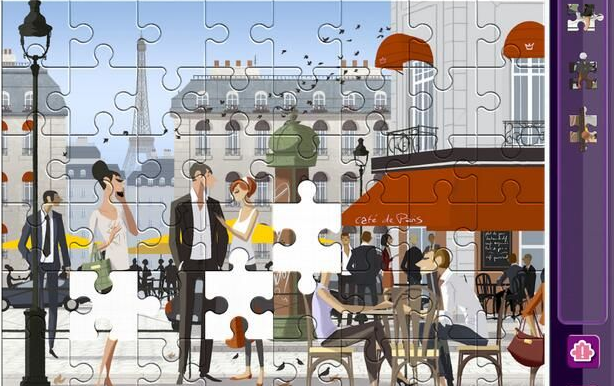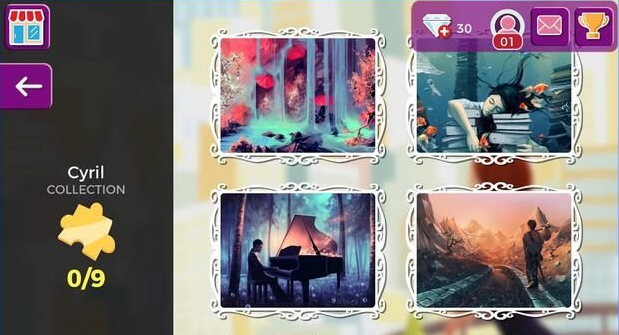 这是一款拼图游戏。每一幅都是来自于世界各地才华横溢的艺术家的作品,并且每幅图有4种难度可以选择。