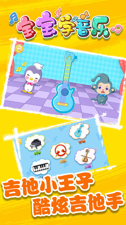 《宝宝学音乐》是一款音乐休闲学习软件,适合学龄前的宝宝玩耍。宝宝学音乐游戏教育向十足,在这款游戏中孩子们会接触到各式各样的乐器,例如小提琴、钢琴和吉他等等,让孩子能够慢慢的了解关于音乐方面的知识