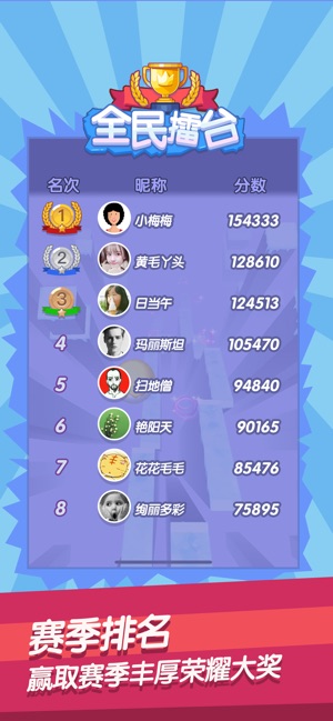 《全民擂台2》是一款多人在线竞技类的游戏,在这里包含海量的小游戏合集,玩家选择喜欢的进入即可联机与在线的玩家一起体验,还可以邀请在线好友一起加入游戏。玩家通过获胜可以获得一定的金币和等级提升,等级能够登陆排行榜,提供给所有游戏内的玩家查看,排行榜靠前的玩家在赛季奖励结算,还可获得丰厚的道具奖励!整体玩法比较多,没有什么限制!尽可能的挑战获取高分吧!
