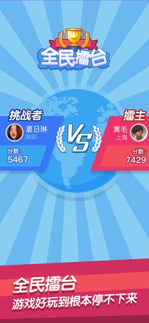 打擂台,人少了没有那种万众瞩目的感觉,赢了也没有什么感觉,只有人多了,才会显得自己很厉害。《全民擂台2》是一款趣味十足的休闲益智游戏。游戏的玩法十分的简单,匹配双人对战,谁率先完成游戏且得分较高者就可以获得游戏的胜利。可以轻轻松松的体验到游戏带来的无限乐趣。感兴趣的小伙伴赶紧来点击下载《全民擂台2》吧!